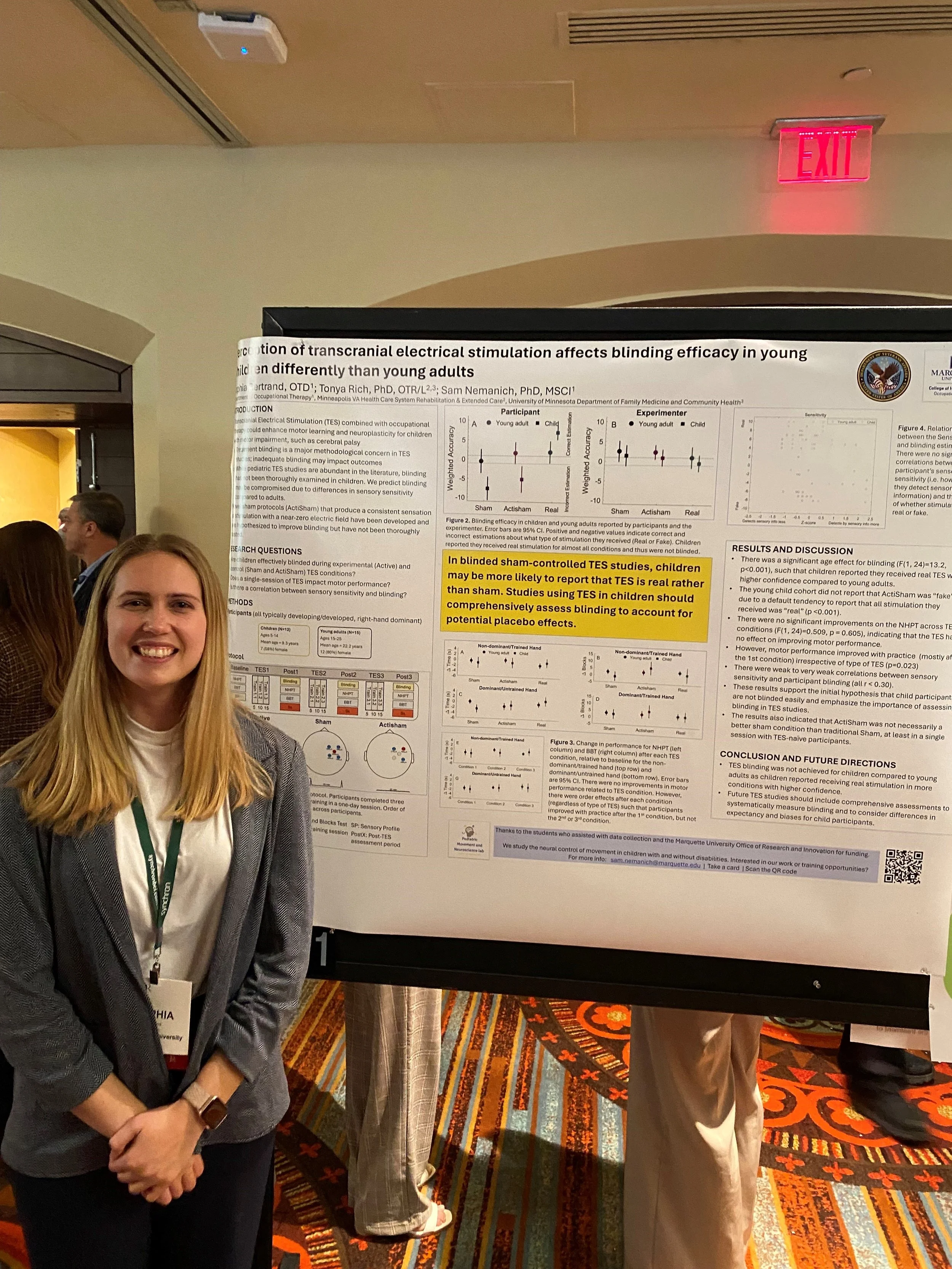 We presented our abstract during a poster session at the AOTA conference. Our abstract focused on the relationship between school environment and engagement with the occupations of play, sleep, and leisure in children during the COVID-19 pandemic. We were able to interact with a variety of individuals at the conference and further discuss our research. We had a great time presenting and meeting other researchers!